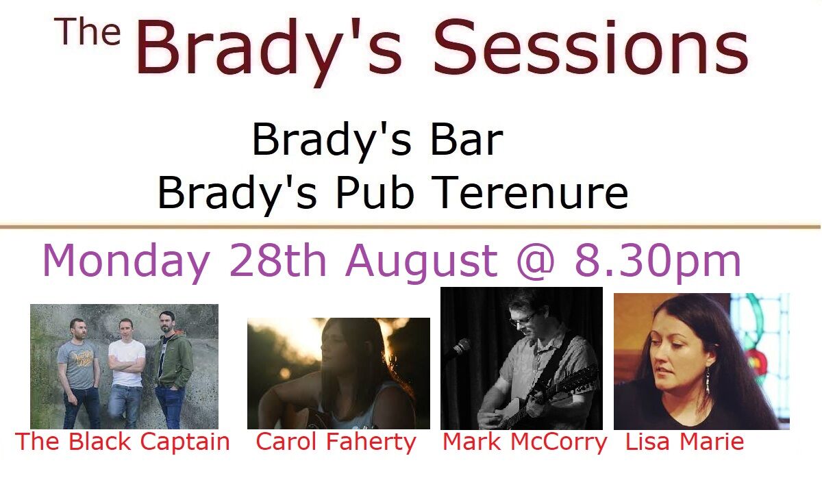 The Brady’s Sessions are on Monday 28th August from 8.30pm in Brady’s Bar, Terenure, Dublin 6w. Playing on the night are The Black Captain, Carol Faherty, Mark McCorry, Lisa Marie. Feel free to give donations on the night to help the acts.